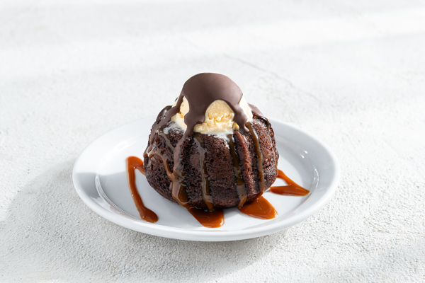 Mini version of our Molten Chocolate Cake. Moist chocolate cake with a melted chocolate center. Topped with vanilla ice cream & a thin chocolate shell.